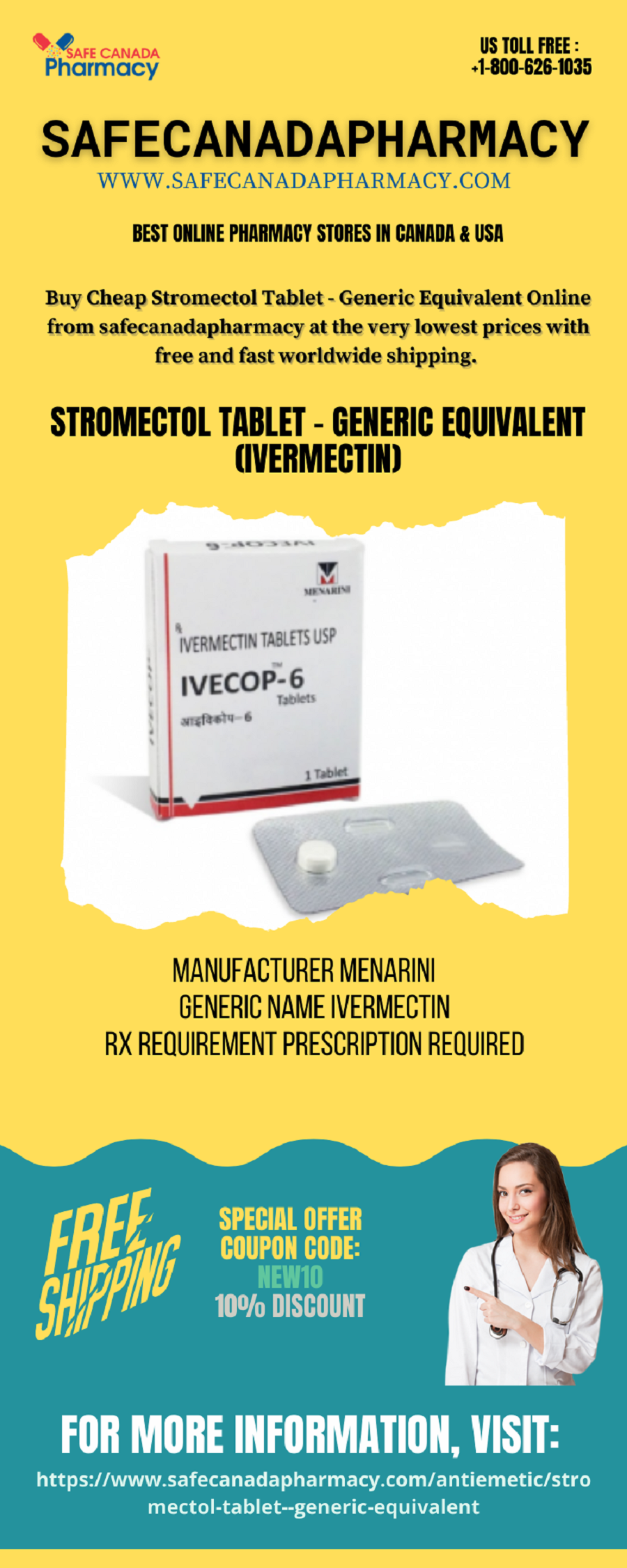Buy cheap stromectol 6mg & 12mg tablet online from SafeCanadaPharmacy at affordable prices with free and fast worldwide shipping. Order now. Stromectol is an anti-parasite medication is used to treat certain parasitic roundworm infections. For more information, visit: https://www.safecanadapharmacy.com/antiemetic/stromectol-tablet--generic-equivalent